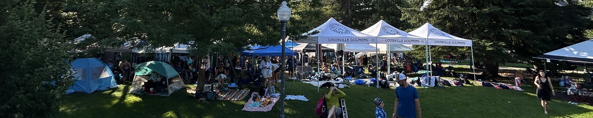 If you take a look at the Memory Square Pool and wonder how we could possibly pack hundreds of kids and their families into that space, the answer is Memory Square Park. The City of Louisville graciously allows us to take over the entire park, filling it with tents and creating a festive atmosphere for the duration of the meet. Other teams offer variations on that same arrangement. Most swimmers and families split their time between competing and cheering on the pool deck and relaxing in the tent city. We always strive to tread lightly and leave the pool and the park area clean and in great condition when the meet is done.